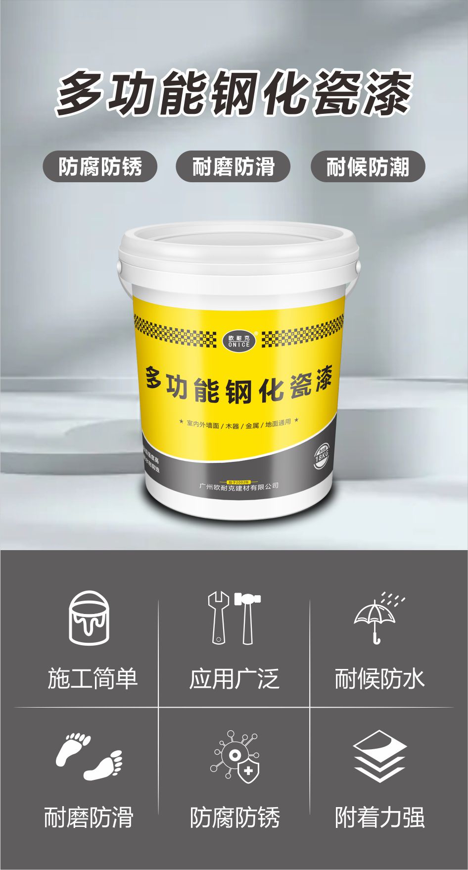 歐耐克多功能鋼化瓷漆是以優(yōu)質(zhì)丙烯酸乳液為基料,精選超細度的無機、無毒顏料經(jīng)科學配料,嚴格調(diào)制而成,達到防銹、防腐蝕的優(yōu)異效果,以水為稀釋劑,無毒無味,無污染,不燃不爆,確保環(huán)境保護和人體健康。